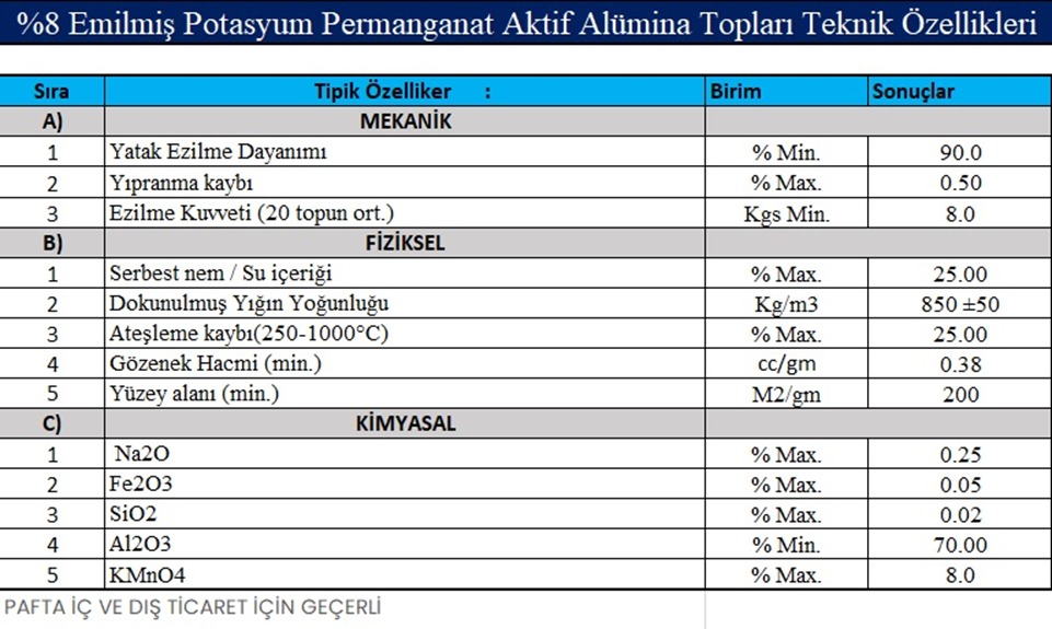 Emilmiş Potasyum Permanganat Alüminalar